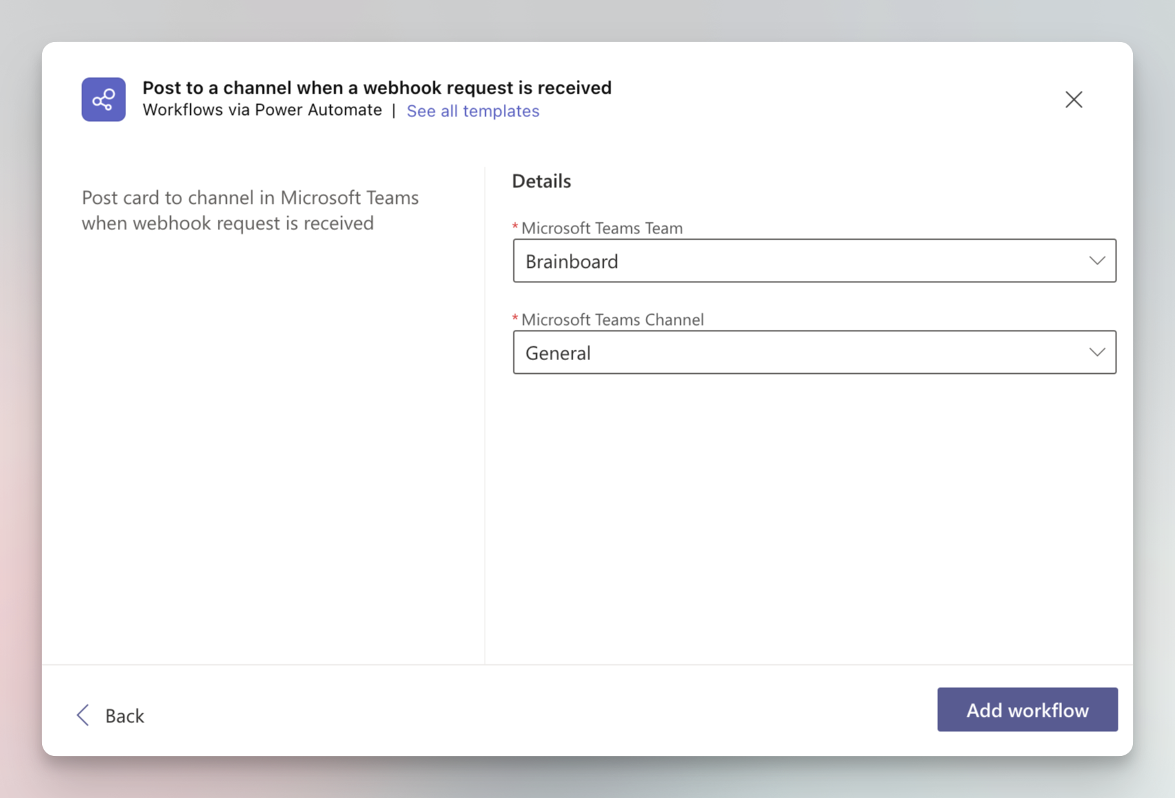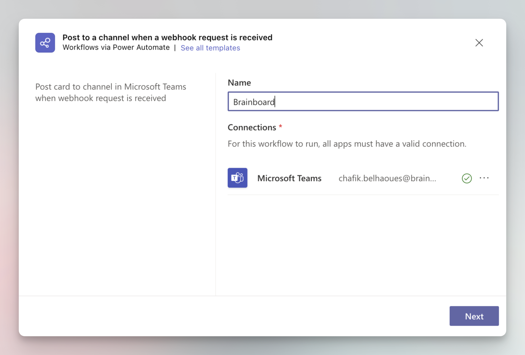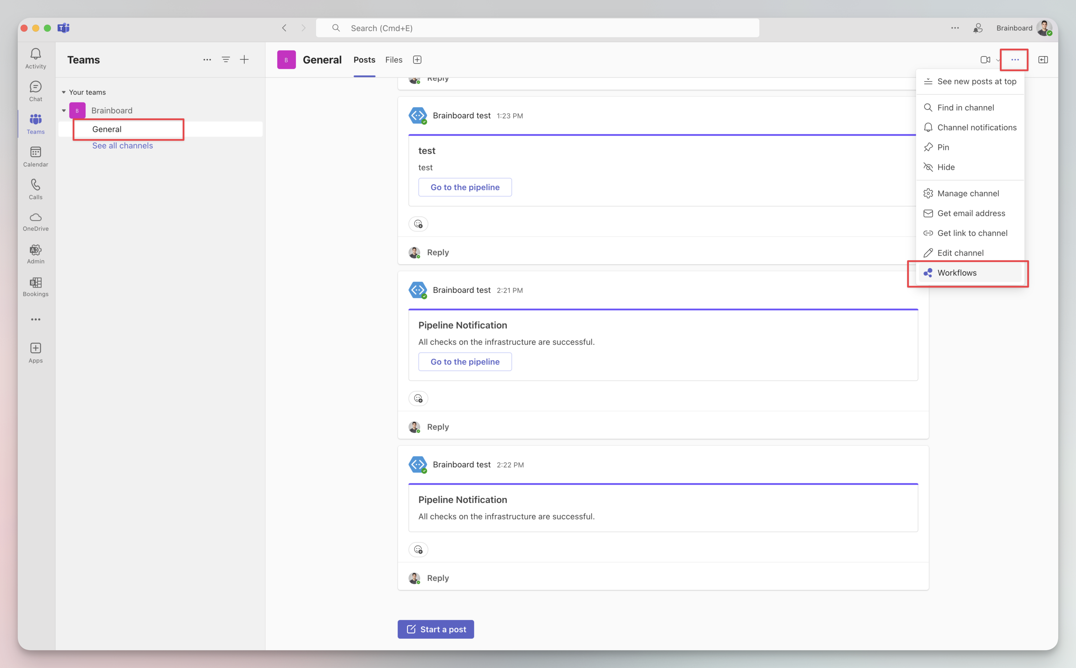 If you want to configure Microsoft Teams to receive notifications from Brainboard pipelines, an *incoming hook* needs to be set up in the channel of your choice. To do so, follow the steps: