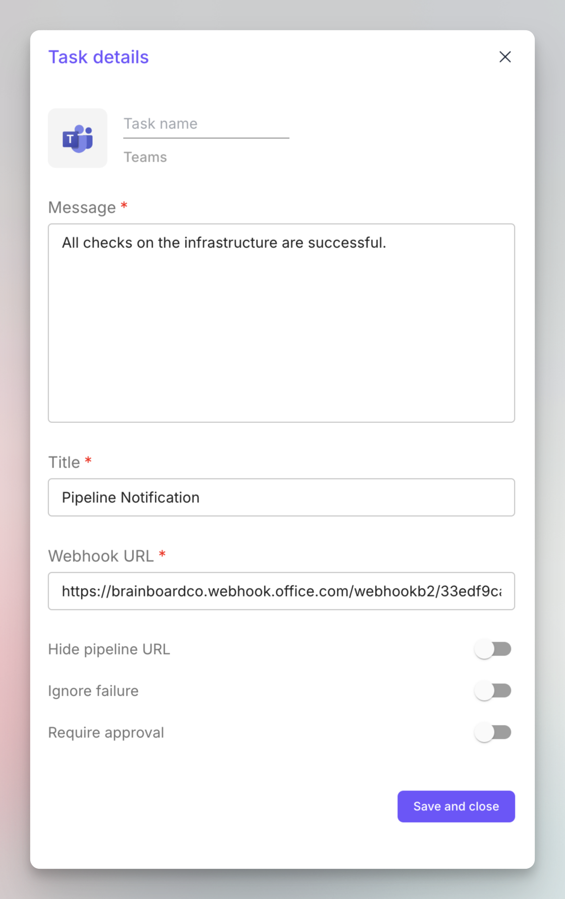 5. Hide pipeline URL: Do not add the button with link to the pipeline in the adaptive card of the message displayed in the Teams channel.