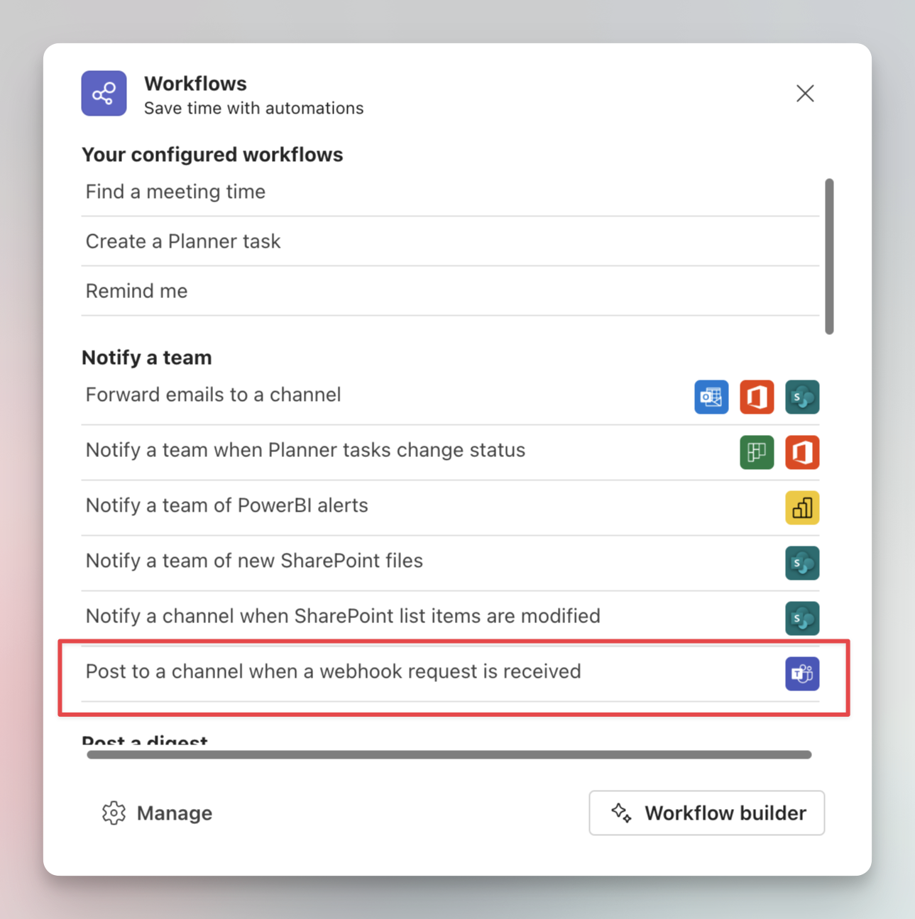 2. This will open the workflows configuration wizard. Search and select the line "Post to a channel when a webhook request is received":