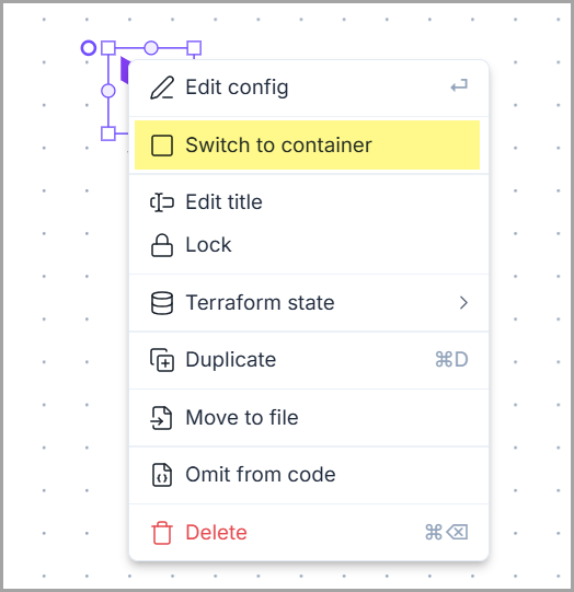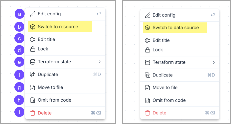 <table><thead><tr><th width="58.92578125">#</th><th width="684.6141357421875">Menu item</th></tr></thead><tbody><tr><td>a</td><td>Open the Resource Configuration panel to update the cloud configuration.</td></tr><tr><td>b</td><td>Switch the resource into data and vice versa.</td></tr><tr><td>c</td><td>Change the title of the node.</td></tr><tr><td>d</td><td>This allows you to lock/unlock the node graphically, which means it cannot be moved, resized, deleted or modified.</td></tr><tr><td>e</td><td>❓❓</td></tr><tr><td>f</td><td>Duplicate the node.</td></tr><tr><td>g</td><td>❓❓</td></tr><tr><td>h</td><td><p>Disable the Terraform code generation of the node without deleting it from the design</p><p>You can enable the code by right-clicking on the resource and choosing the option <code>Add to code</code></p></td></tr><tr><td>i</td><td>Delete the node from the design and the generated code.</td></tr></tbody></table>