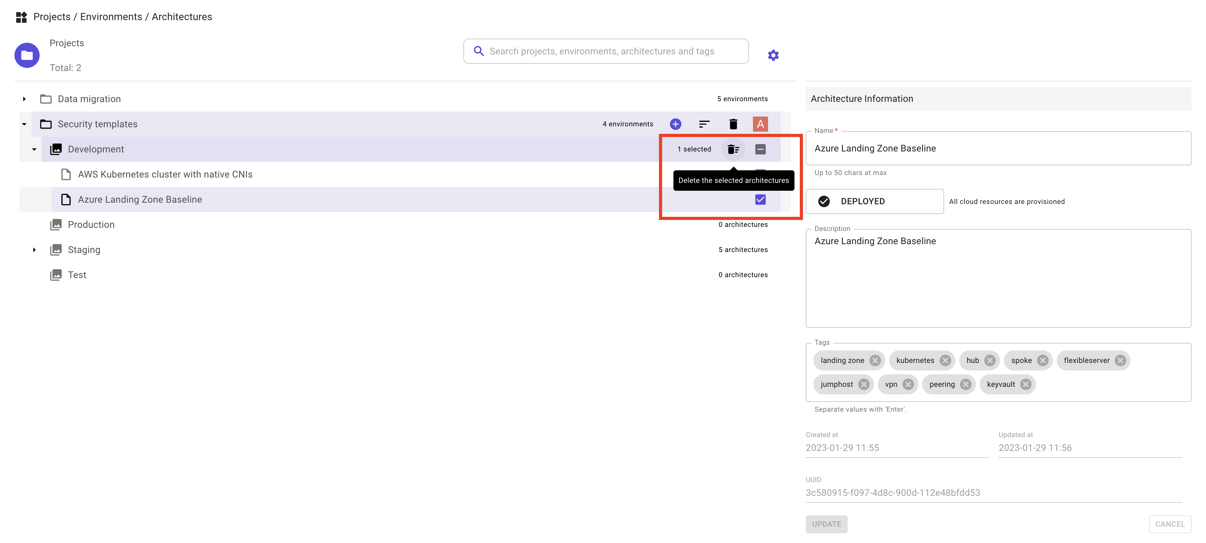 Deleting an architecture, environment or project cannot be undone