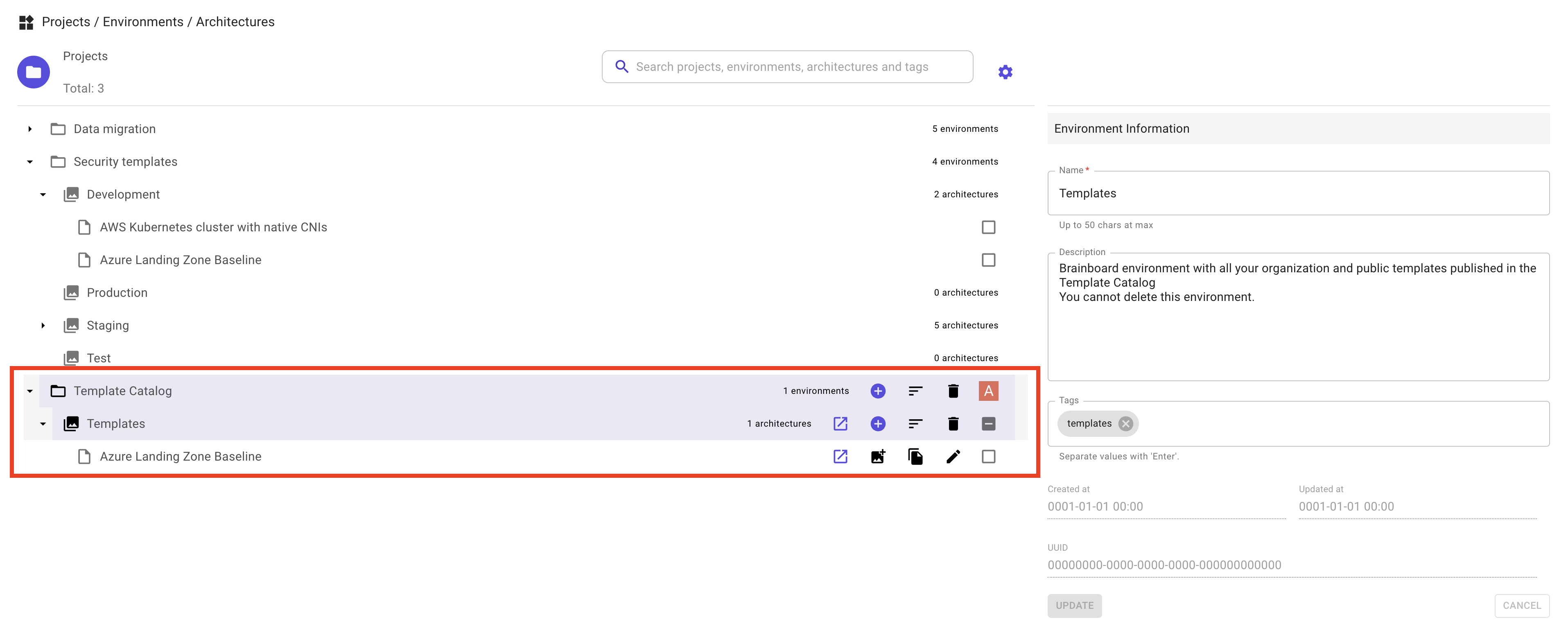 * You cannot delete the project `Template catalog` nor the environment `Templates`. They will be removed automatically when you remove all your templates.