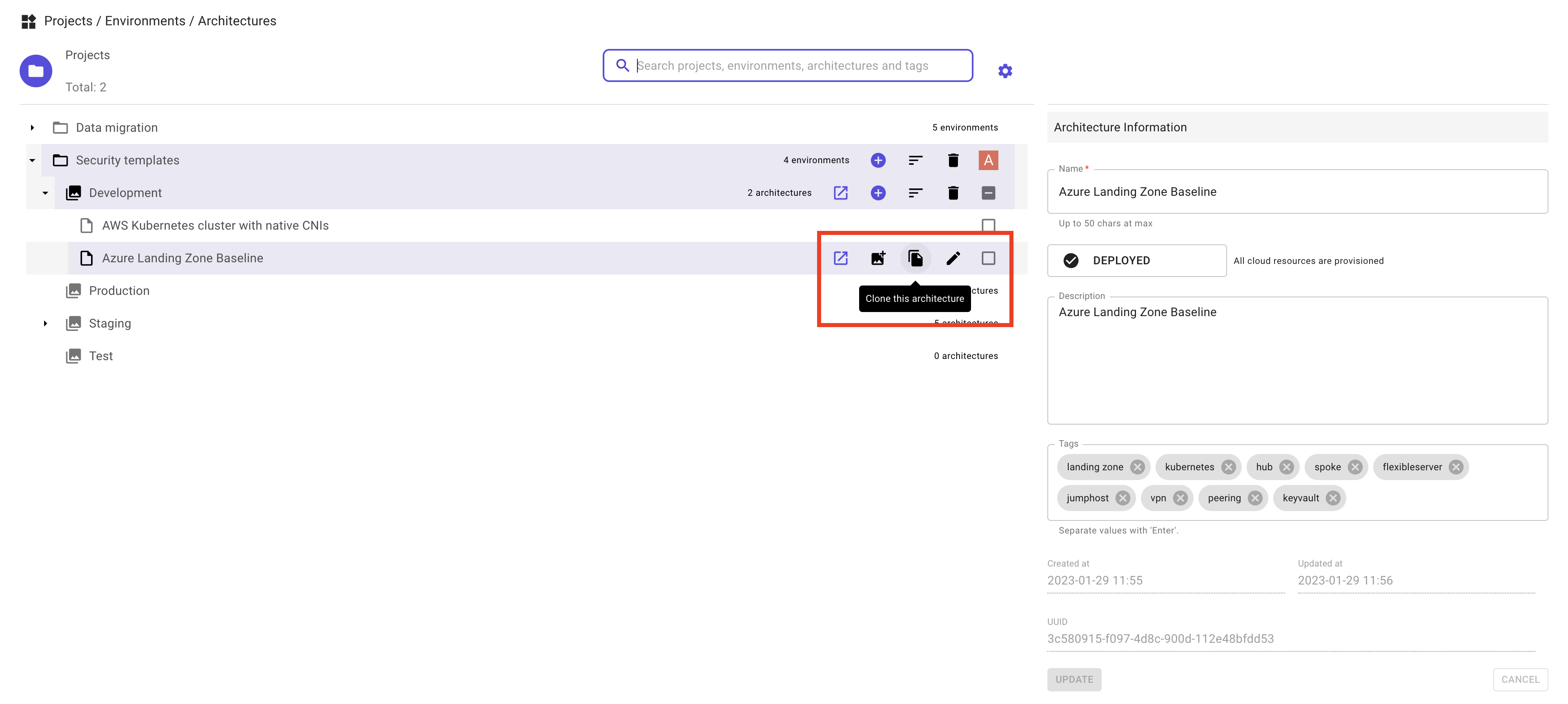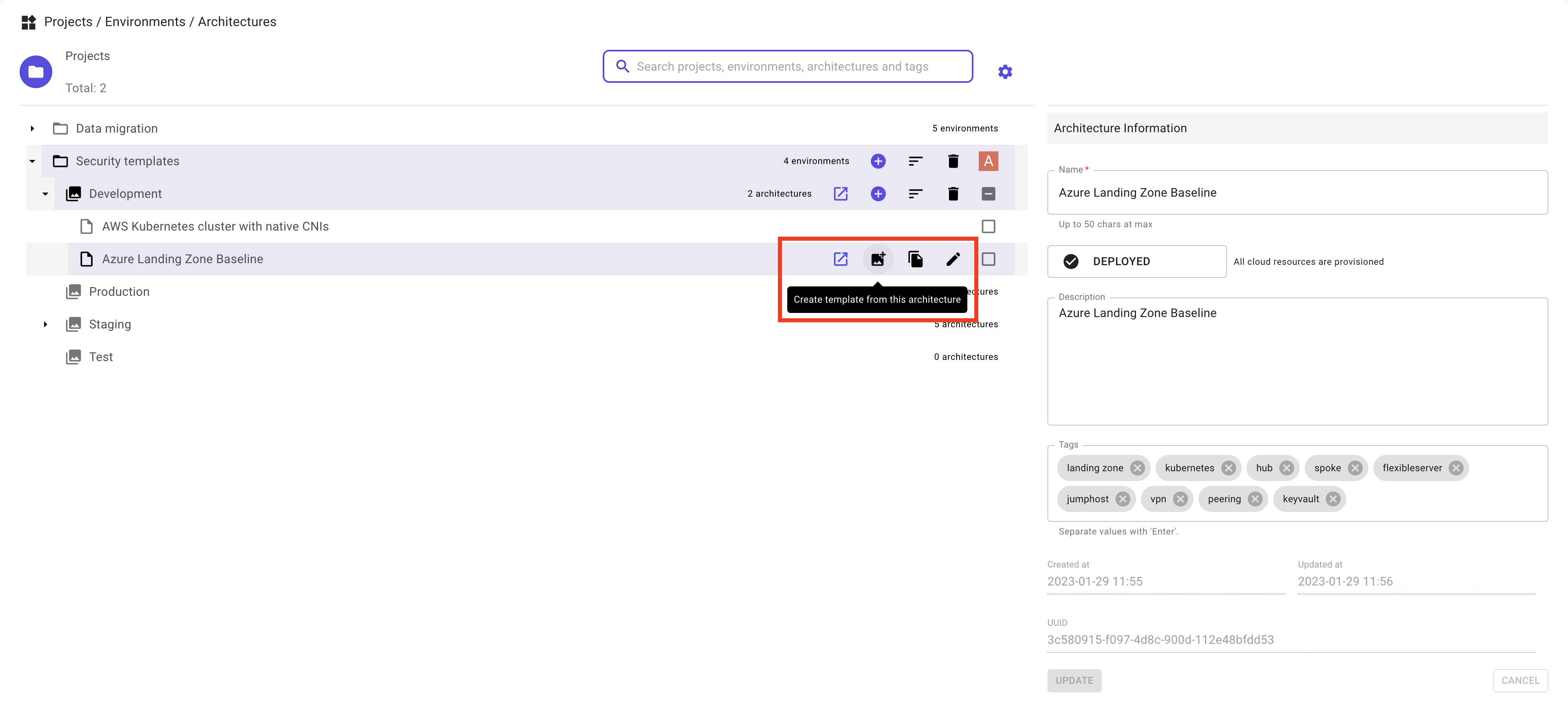 All high-level information related to the architecture is accessible from the list of projects, environments and architectures.