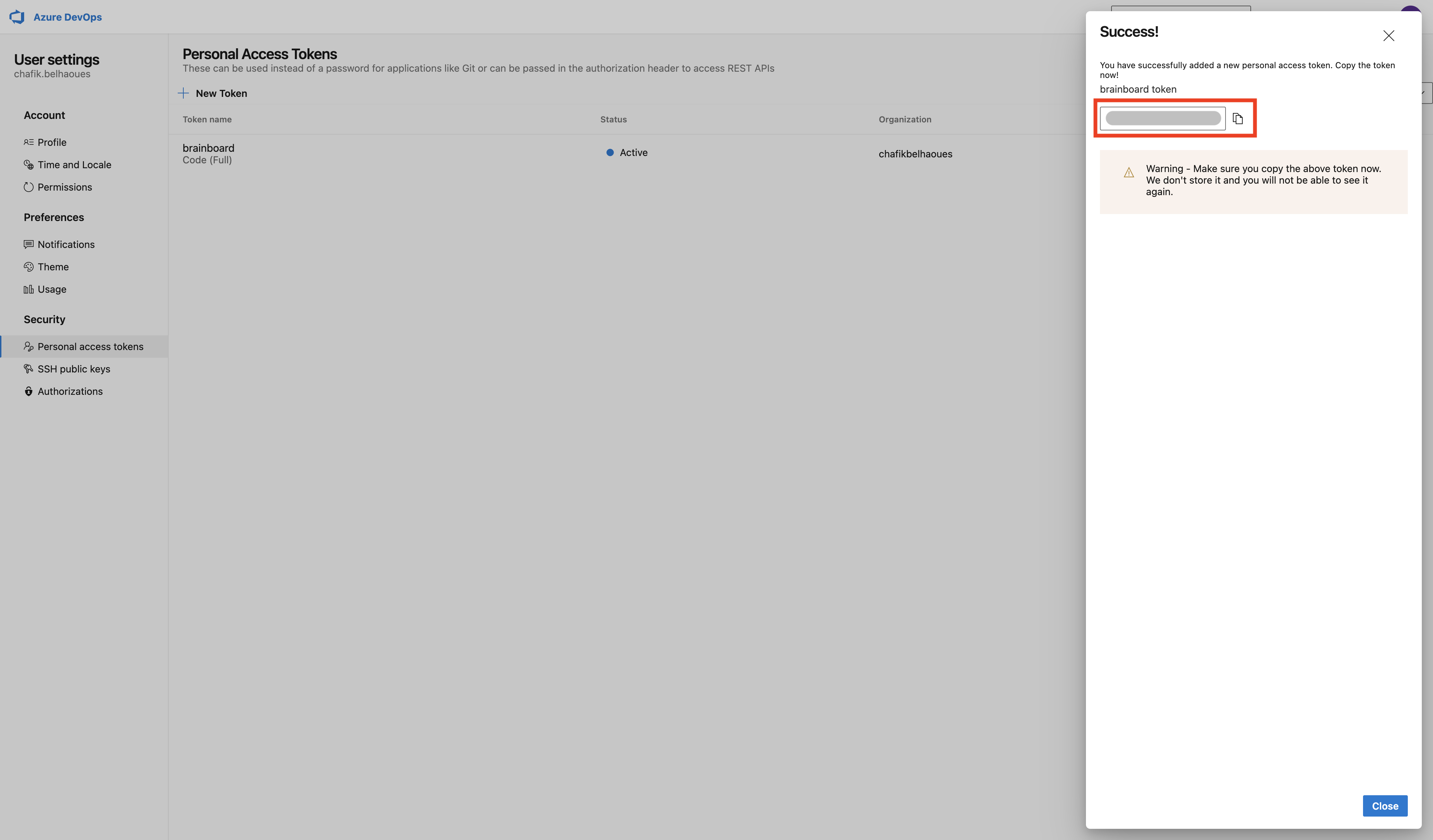 To add Azure DevOps personal git tokens in Brainboard, you first need to generate an Azure DevOps personal access token.
