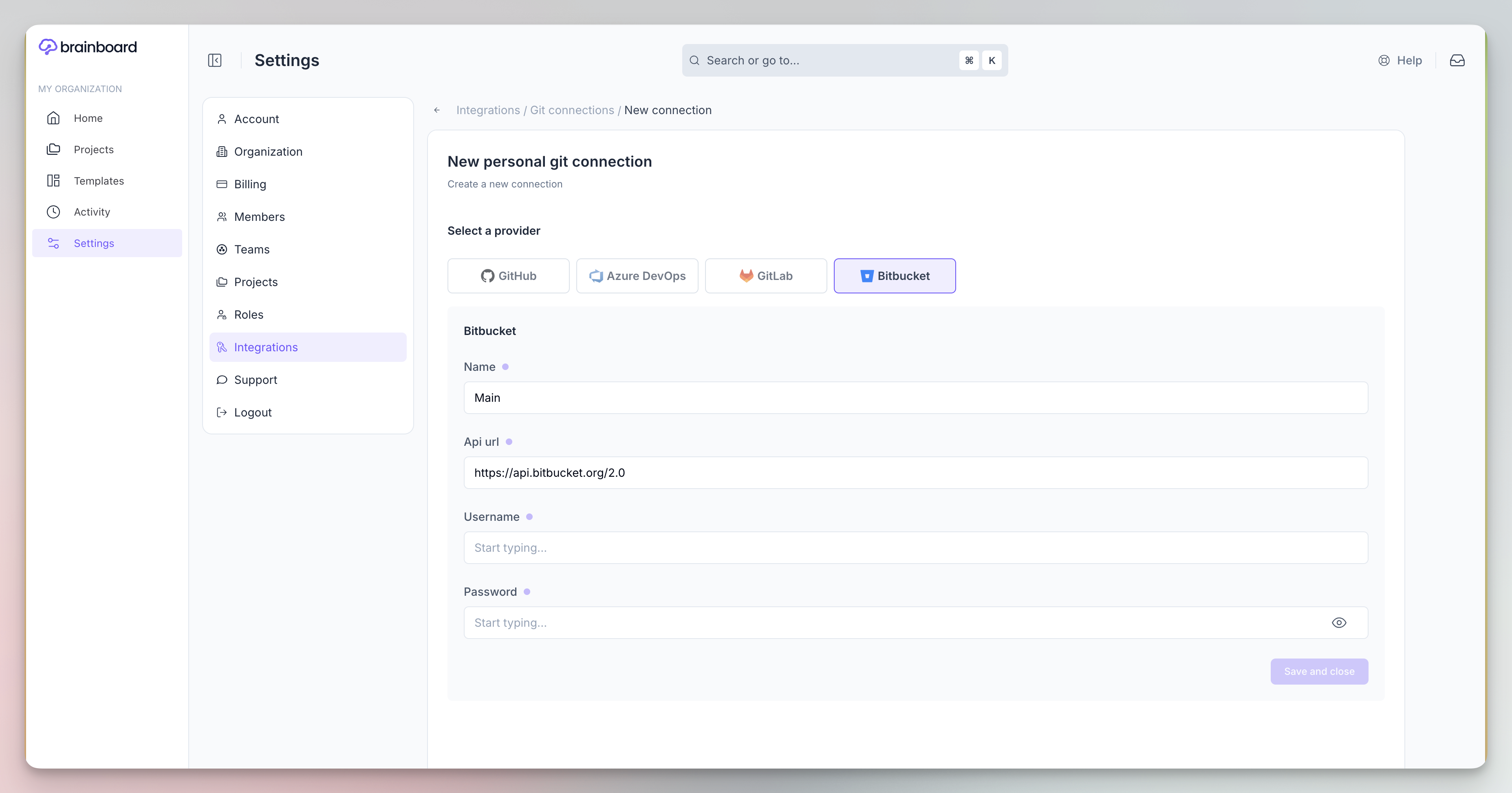 * The URL of your Bitbucket server: by default Brainboard uses `https://api.bitbucket.org/2.0` but you can set your own URL.