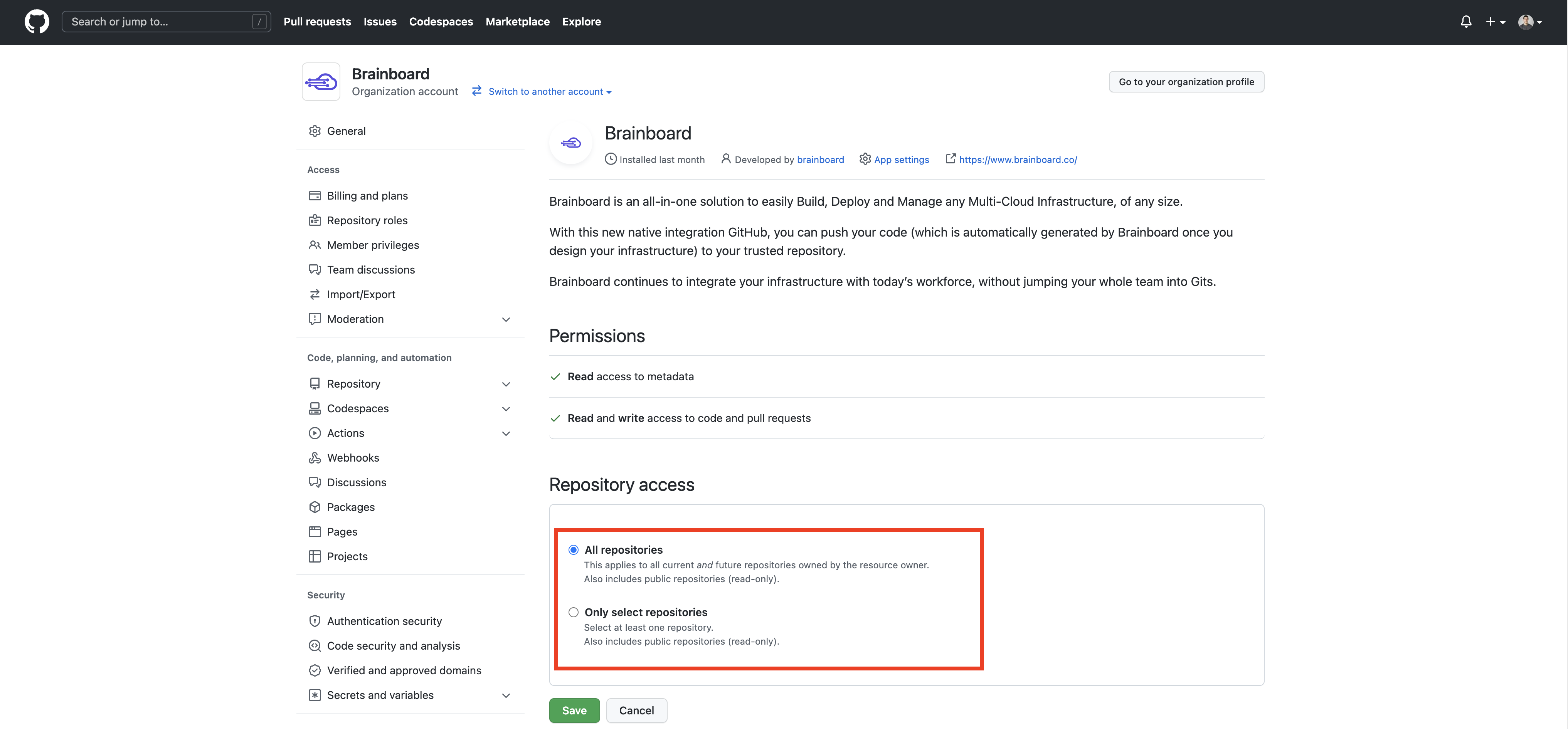**N.B:** Brainboard requires `read-write` access to be able to do pull requests.